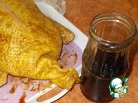 На грудке делаем надрезы небольшой глубины, которые рассекают лишь кожу и жир, не затрагивая мясо. Смазываем маринадом всю тушку внутри и снаружи. |
