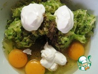 Добавить к ним яйца, сметану, щепотку соли и черный перец. Тщательно перемешать. Добавить муку и разрыхлитель теста. Перемешать. |