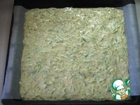 Застелить противень бумагой для выпечки (размер моего 29 х 33), смазать растительным маслом. Выложить кабачковое тесто, равномерно распределив по всей поверхности ровным слоем. |