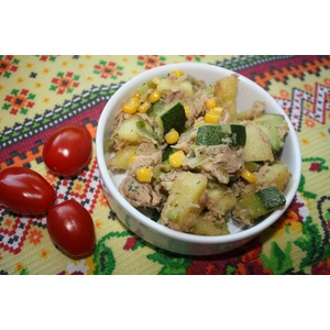 С консервов кукурузы и тунца слить жидкость. Тунец размять вилкой. Добавить к овощам. Посыпать мелко нарезаным укропом. Готовить все вместе еще 5 минут. |