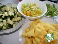Приготовим овощи. Нарезать кубиком картофель и кабачки, перец соломкой. |