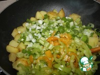 Добавить к картофелю перец, чеснок и зеленый лук. Обжариваем вместе около 6 минут. Солим и перчим по вкусу. |