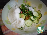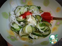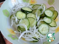 Лук почистить, нарезать перьями, добавить к огурцам. |