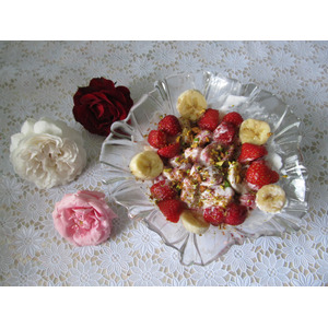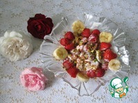 Салат украсить отложенными кусочками банана и клубники и посыпать измельченными фисташками. Убрать в холодильник на 15 минут. Приятного аппетита! |