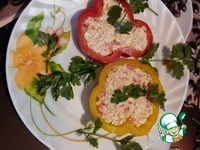 Зафаршировать смесью перцы, поставить в холодильник часа на полтора. Вынуть, аккуратно порезать и выложить на блюдо. Готово, наслаждайтесь) |