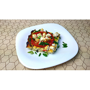 Поверх пирога выложить кружочки помидора, посыпать кубиками феты и сбрызнуть оливковым маслом. Выпекать ещё 15 минут при 180°С.