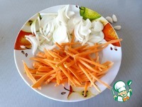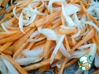 Слегка припустить лук и морковь на растительном масле. Не надо зажаривать, нужно, чтобы овощи слегка обмякли, но остались хрустящими. |
