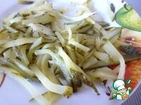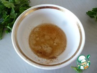 Приготовить заправку из перца, кориандра, уксуса, растительного масла, соли и щепотки сахара. Чеснок нарезать пластинками и добавить в заправку. |