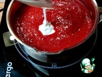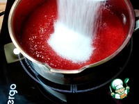 Ставим измельченную клубнику на огонь, добавляем сахар |