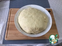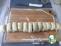 Через час тесто должно поднятся, тогда можно к приступать к формированию булочек. Для начала делим тесто на 2 части. |