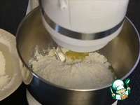 В миске соединяю молоко с дрожжами, растопленное остывшее! сливочное масло, оставшийся сахар, соль и 2/3 муки. На минимальной скорости замешиваю тесто (или руками). |