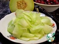 Дыню очистим от корочки и нарежем очень тонкими полупрозрачными ломтиками. Для варенья лучше выбирать небольшую твердую дыню. |