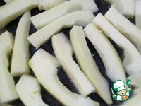 Нарежем кабачок брусочками. У меня кабачок среднего возраста, поэтому я сняла шкурку и удалила семечки |