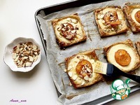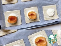 Слоёное тесто разрезать на квадратики примерно 9х9 см. Противень застелить пергаментом и на него выложить тесто. Второй половиной яйца смазать края каждого квадратика. |