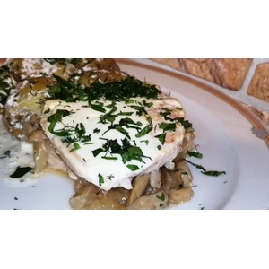 Шаг 7. На тарелку выкладываем часть курицы и грибов, рядом картофель со сметаной и зеленью.