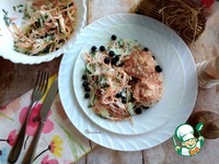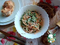 Заправляем сметаной, солим. Добавляем рубленную петрушку. Всё соединяем. Можете поперчить по вкусу вашим любимым перцем. |