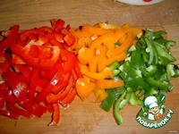 2. Моем и очищаем сладкий перец, режем полукольцами или четвертинками. Перец надо взять разных цветов, тогда салат получится очень ярким. |