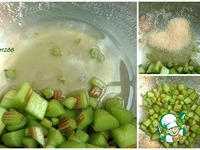 Черешки ревеня, очищенные от прожилок, нарезать на дольки по одному – полтора сантиметра и засыпать ¼ стакана сахара, перемешать. Дать настояться до выделения сока. |