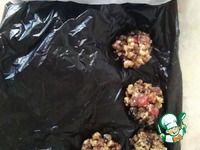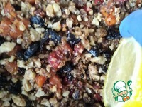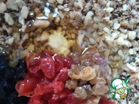 Тем временем, грецкие орехи измельчить крупно скалкой и поджарить быстро на сухой сковороде, высыпать в глубокую миску. Размягчившиеся сухофрукты мелко порезать и высыпать к орехам. |