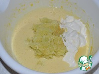 Кабачок отжать, добавить вместе со сметаной к яичной смеси и перемешать. |