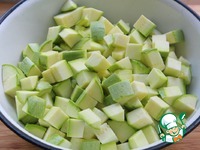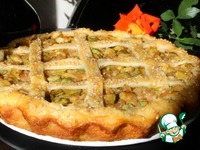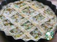 Сверху выкладываем кабачковый слой. Из оставшегося теста сделать полоски. Оформить пирог. Смазать желтком и посыпать кунжутом по желанию. |