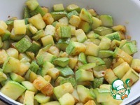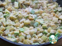 Добавить сметану в лук, перемешать, протомить минуту, добавить кабачки и протушить практически до полного выпаривания жидкости. Остудить, добавить по вкусу соль и перец. |