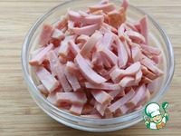 В форму выложить2/3 теста тонким слоем - бортики обязательны. На тесто выложить колбасу с сосиской. |