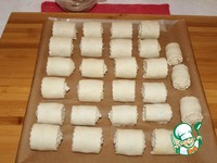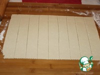 Раскатываем в пласт толщиной 3-4 мм. Обрезаем неровные края. Нарезаем полосками по 4-5 см. |