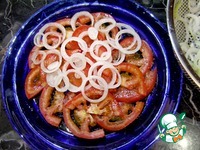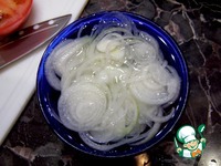 Заливаем лук водой, смешанной с уксусом и оставляем мариноваться на некоторое время (пока подготовим томаты). |