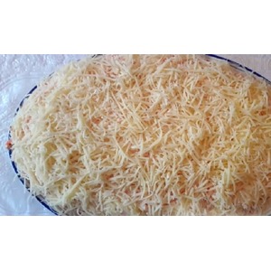 И завершающим слоем раскладываем тертый сыр.
