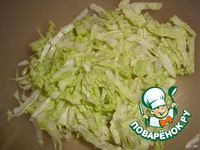 Пекинскую капусту вымыть и нарезать поперёк тонкими полосками. |
