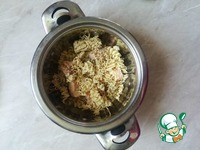 В отдельную чашу добавить рыбные консервы из красной рыбы, из которых нужно убрать большие косточки. Поломать туда вермишель (заваривать её не надо). Перемешать. |
