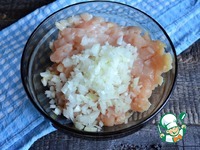 Куриную грудку зачистить от плёнки, нарезать кубиком, 0,7-1 см., добавить манку. Лук порезать мелко, посолить, слегка потолочь, добавить к грудке. |