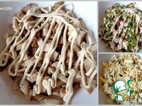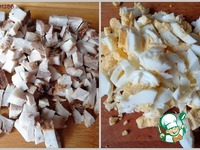 Собрать салат: первый слой мясо с майонезом. Посыпать зеленым луком. Второй слой яйцо с майонезом. |