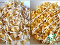 Следующий слой яблоко с майонезом. Затем слой кукурузы с майонезом. |