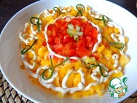 В завершении разложить по кругу желтый перец, не закрывая середину. В центре разместить красный перец. Нанести майонез. Оформить по желанию. Приятного аппетита!!! |