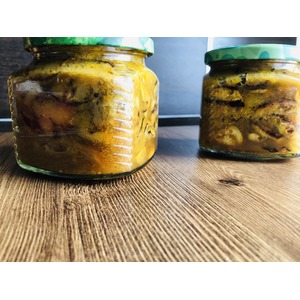 5. Раскладываем обжаренные баклажаны в стерилизованные банки до половины, заливаем соусом и выкладываем оставшиеся баклажаны, сверху добавляем соус. Соус должен равномерно распределится по банки закрыв баклажаны.