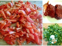 Сладкий перец и зелень кинзы порезать произвольно. Подготовить томатную пасту. |