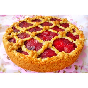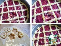 Остывшую начинку выложить на тесто. На начинку выложить ленточки, в местах перехлеста прижать. Тесто над начинкой прижать (наложить на нее). |