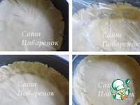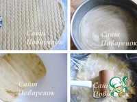 Руки припылить мукой, разровнять тесто по форме. Можно воспользоваться небольшим валиком и прокатать тесто через пищевую пленку. Снять кольцо. Стянуть тесто вместе с пленкой на подложку для торта. |