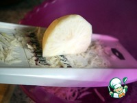 Можно взять другую терку, но мне нравится, когда клубень превращается в такие вот тонкие полоски. |