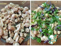 Собрать салат: первый слой мясо и ароматная зелень. |