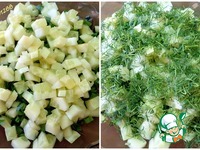 Сверху огурцы и укроп. |