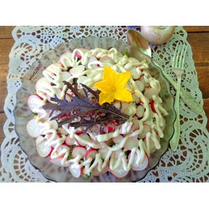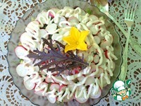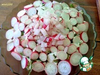 Верху разложить жаренные кабачки. Завершить салат редисом. По внешнему кругу разместить редис пластинками. В центр уложить редис, нарезанный мелко. |