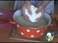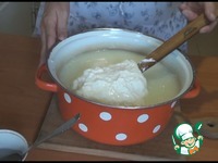 После этого в сыворотку опускаем дуршлаг, в него кладем сыр и оставляем нагреваться минуты 3-4. Процедуру с дуршлагом мы проводим для того, чтобы было легче достать сыр, т. к. жидкость очень горячая. |