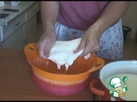 Когда у нас образовалась сыворотка, достаем весь сгусток сыра и сжимаем его руками, чтобы отжать лишнюю жидкость. |