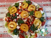 Полить салат заправкой, посолить, поперчить по вкусу, украсить веточками петрушки и кружочками желтого помидора. |
