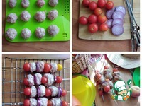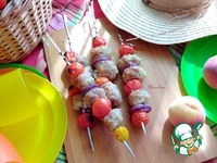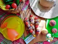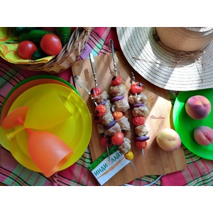 Скатываем из фарша шарики. Крупные делать не нужно, иначе они слетят со шпажек. Оптимальный размер шарика с крупный грецкий орех. Из этого количества фарша у меня получилось 15 шт тефтелей. Готовим шпажки, помидоры-черри (я подобрала размером покрупнее, примерно с тефтелю) и красный лук, который нужно нарезать кольцами не разъединяя, шириной примерно 0,4-0,5 см. Луковицу нужно по размеру тоже подобрать, чтобы она соответствовала тефтелям. Насаживаем все ингредиенты на шпажки, чередуя. Выкладываем на решётку. Нужно, чтобы шпажки на решётки были навесу. Можно конечно и положить, только решётку жиром смажьте, а то тефтели прилипнут. Ставим на мангал и запекаем минут 20-30. Если вы будите делать такие тефтели в духовке под грилем, то подставьте вниз поддон, будет капать сок и жир. Готовы тефтели. |