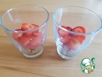 В стаканчики поместить измельчённое печенье. И порезанную дольками клубнику. ( на один стакан уходит примерно 2 клубники) |