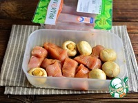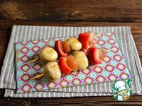 Индейку нарезать на кусочки и замариновать вместе с шампиньонами в соевом соусе с добавление чеснока через пресс. Оставить на 30 минут, шпажки замочить в воде (4 шт) |